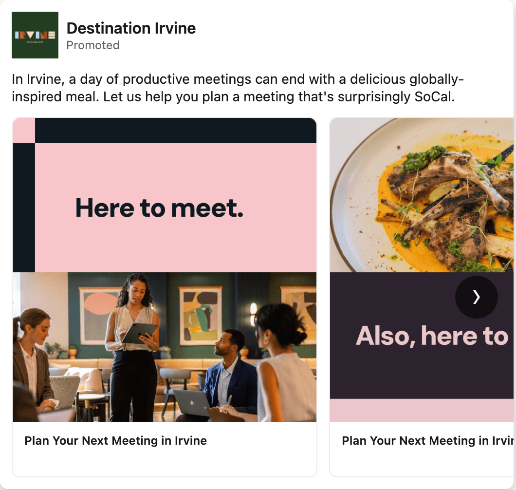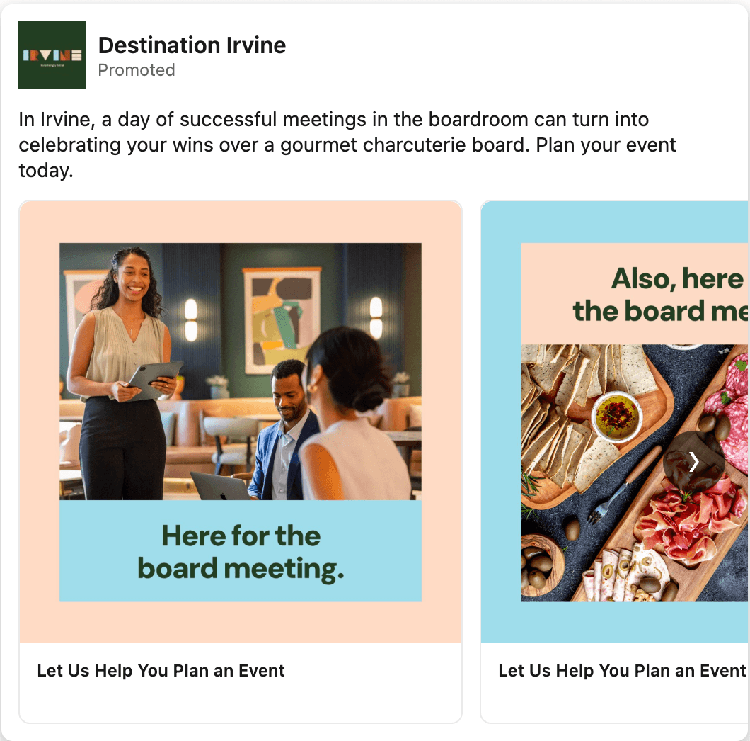 The new brand was brought to life with our Flipside campaign. The idea is that while people may come to Irvine for work or a sports event, that's just the beginning of what there is to experience. Each execution paired a visitor’s reason for coming with a reason to stay. For example, you can come to Irvine for your son's soccer tournament but stay for the California sun.